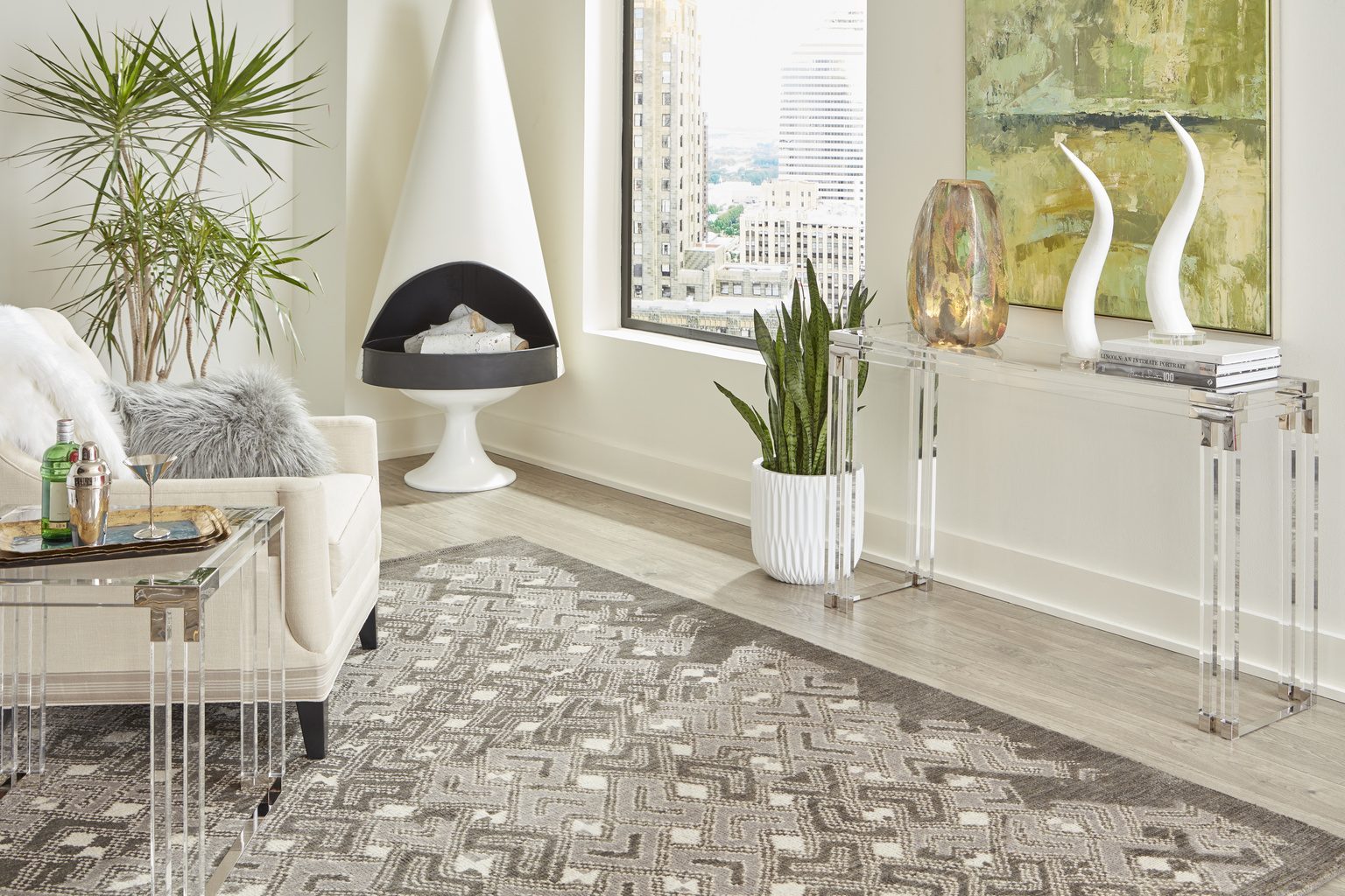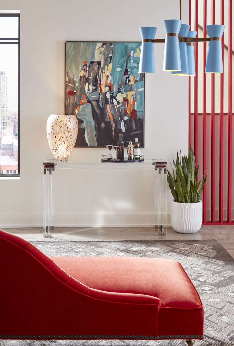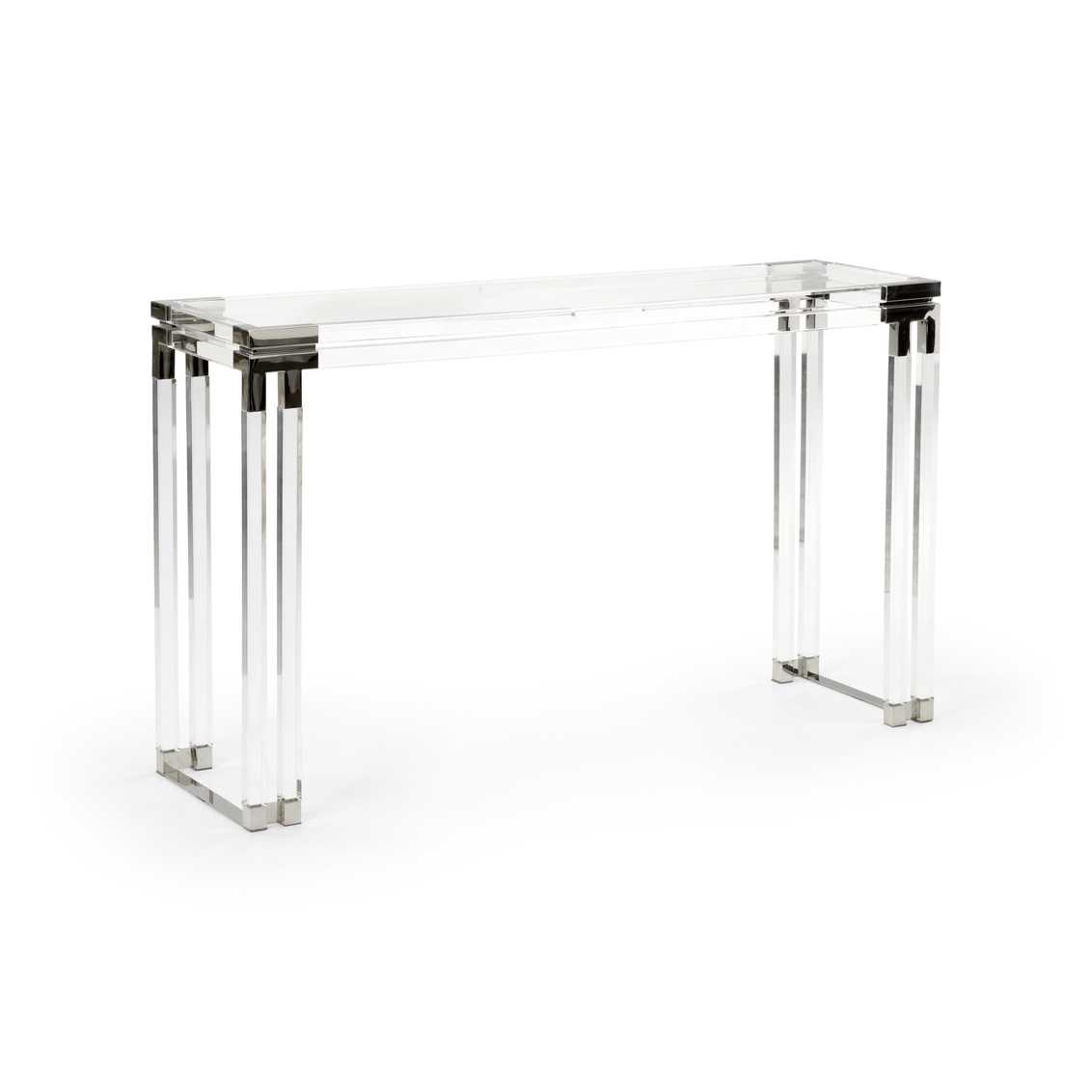 Modern acrylic console with tempered glass top and polished nickel accents.